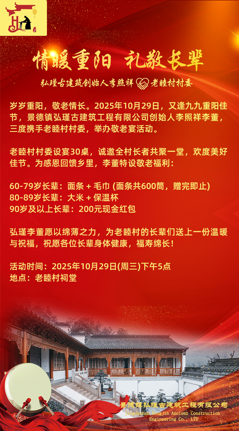 岁岁重阳,敬老情长。2025年10月29日,又逢九九重阳佳节,景德镇弘瑾古建筑工程有限公司创始人李照祥李董,三度携手老睦村村委,举办敬老宴活动。
